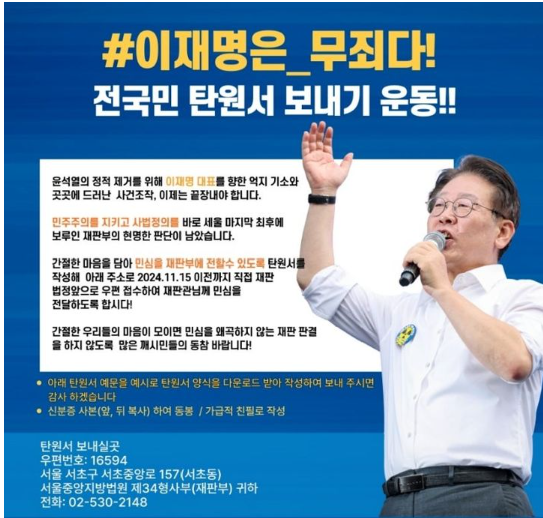이재명 대표의 지지자들은 그의 무죄를 주장하며 활발한 탄원서 운동을 벌이고 있습니다. 대표적인 사례로, '개딸'이라 불리는 지지자 그룹은 서울중앙지법 형사34부에 5일 동안 총 62건의 탄원서를 제출했습니다. 또한 '재명이네 마을'과 같은 온라인 커뮤니티를 중심으로 전국민 탄원서 보내기 운동이 이어지고 있습니다. 탄원서의 주요 내용은 검찰의 정치적 기소를 비판하고 사법 정의를 요구하는 목소리로 채워져 있습니다.