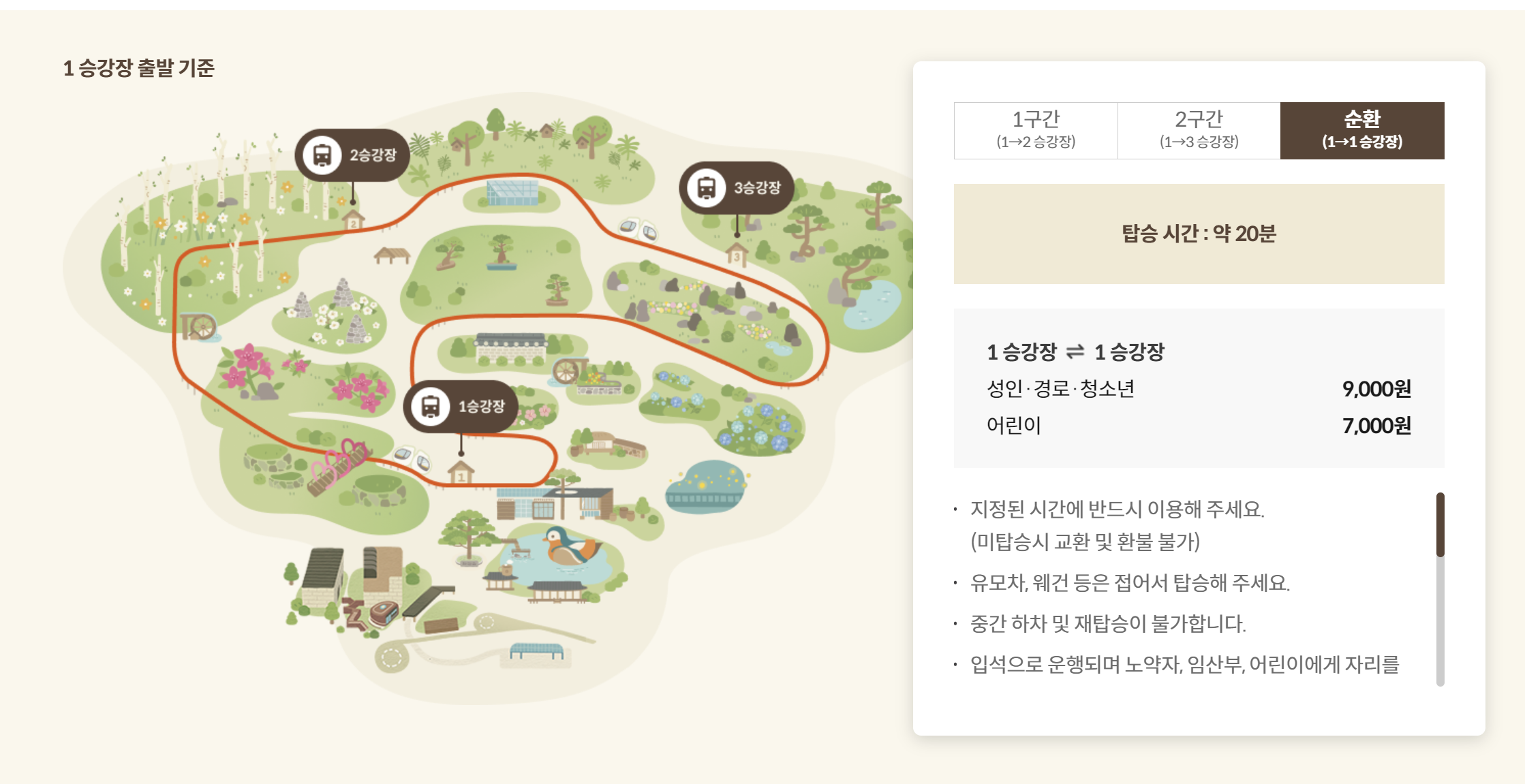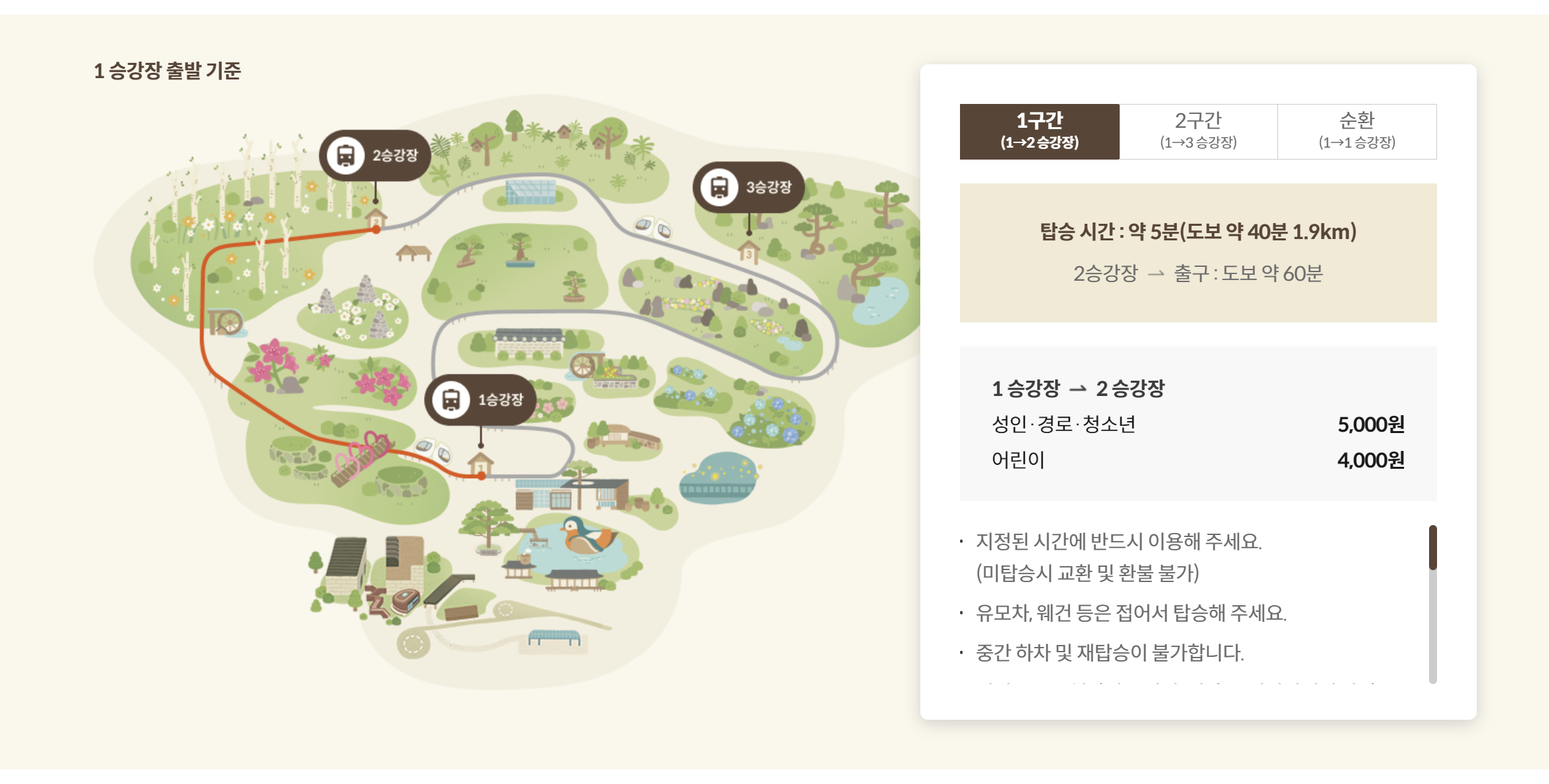 1구간 (1승강장 → 2승강장): 약 1.9km의 거리로, 모노레일 탑승 시간은 약 5분, 도보로는 약 40분이 소요됩니다.
