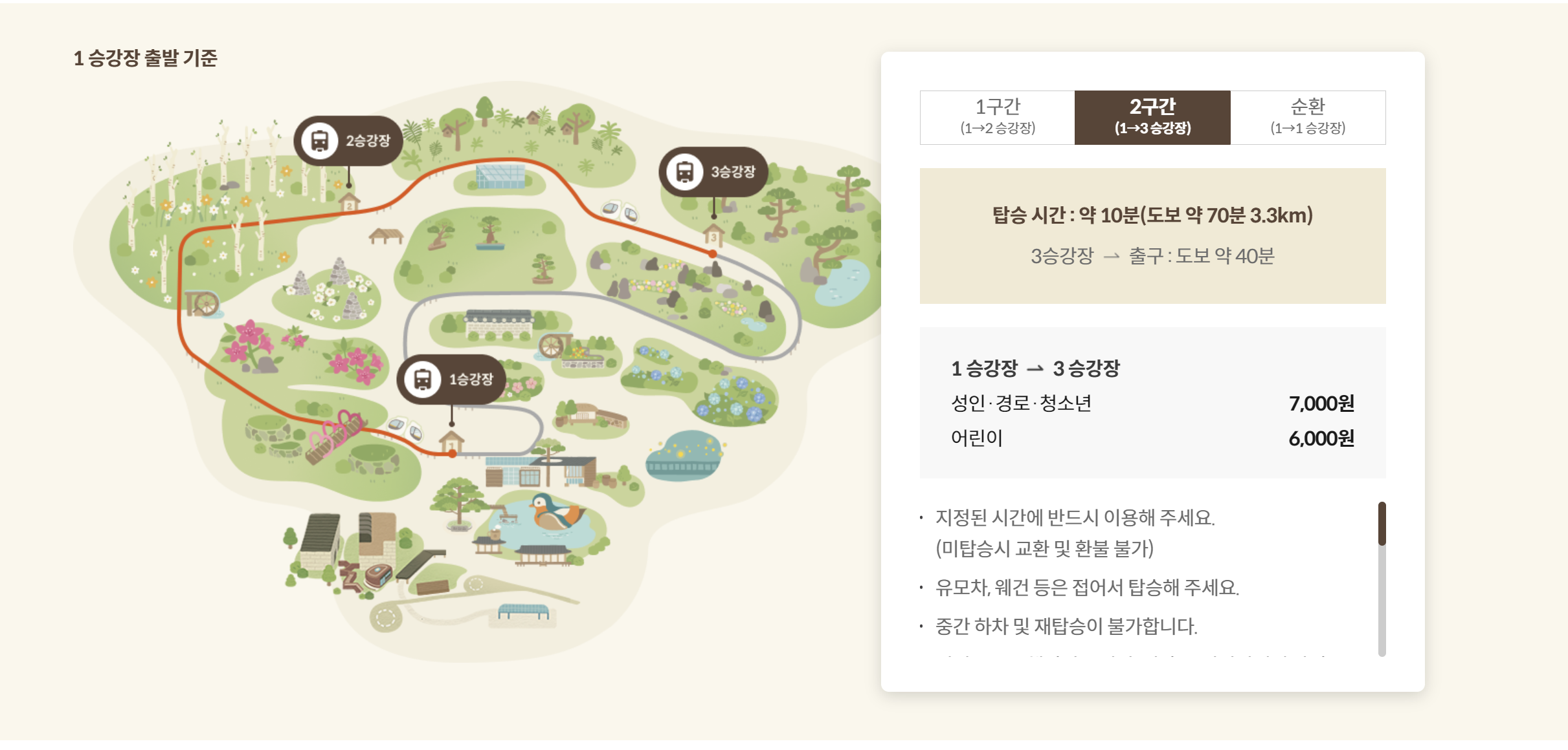 2구간 (1승강장 → 3승강장): 약 3.3km의 거리로, 모노레일 탑승 시간은 약 10분, 도보로는 약 70분이 소요됩니다.